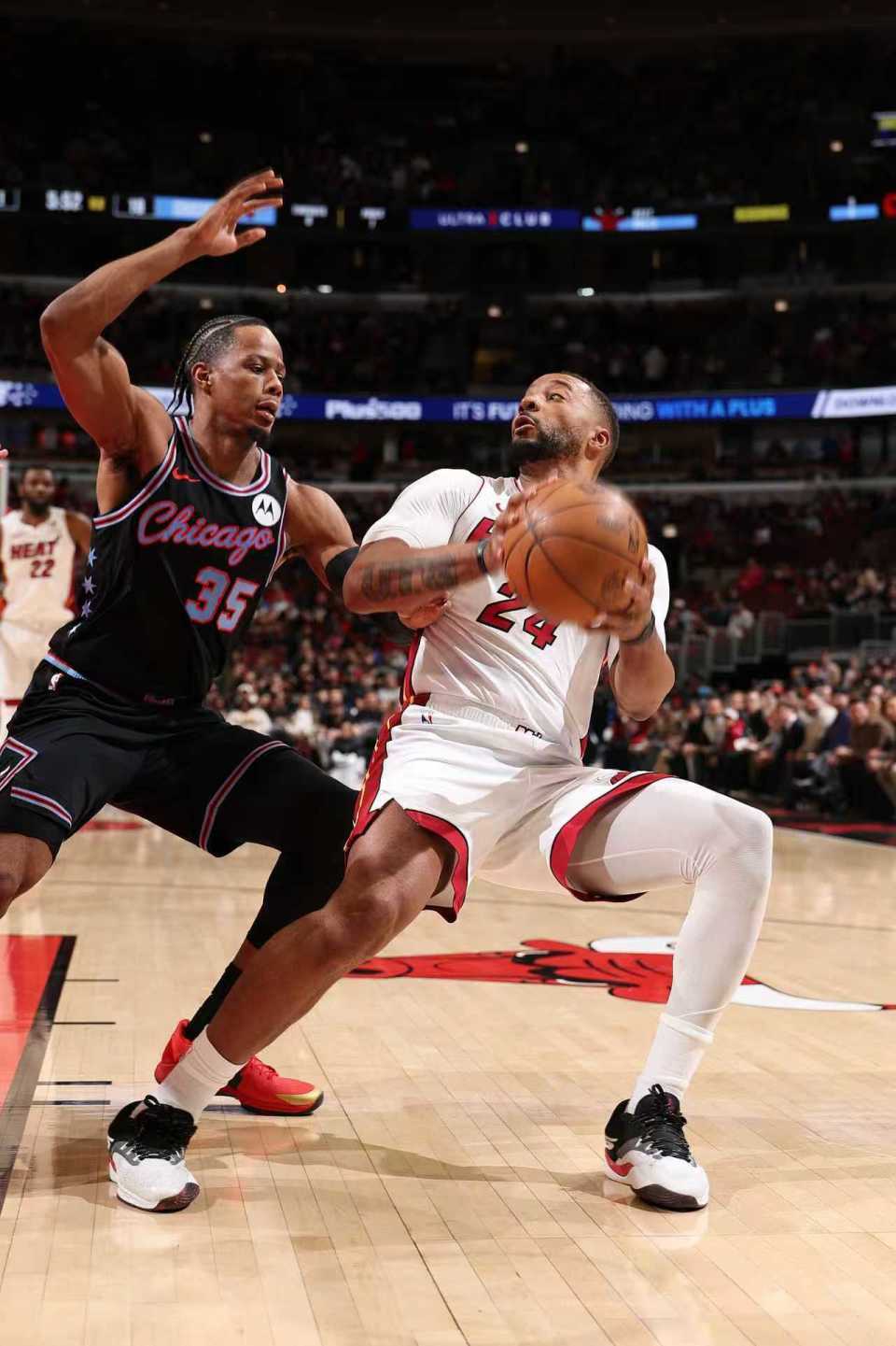 中场休息回来,公牛本场第二次单节得分30+,热火连续两节单节不足30分。热火借助团队攻势压制公牛,在前半节维持78-66领先优势,公牛连追4分。热火再度扩大83-72领先优势,公牛反扑追到个位数差距,热火单节29-34被追回5分,三节结束热火91-85领先公牛。前三节比赛双方均是5人得分上双,热火三分29中11,阿德巴约18+10与鲍威尔17分;公牛三分31中13,武切维奇13+8与赫尔特15+7。